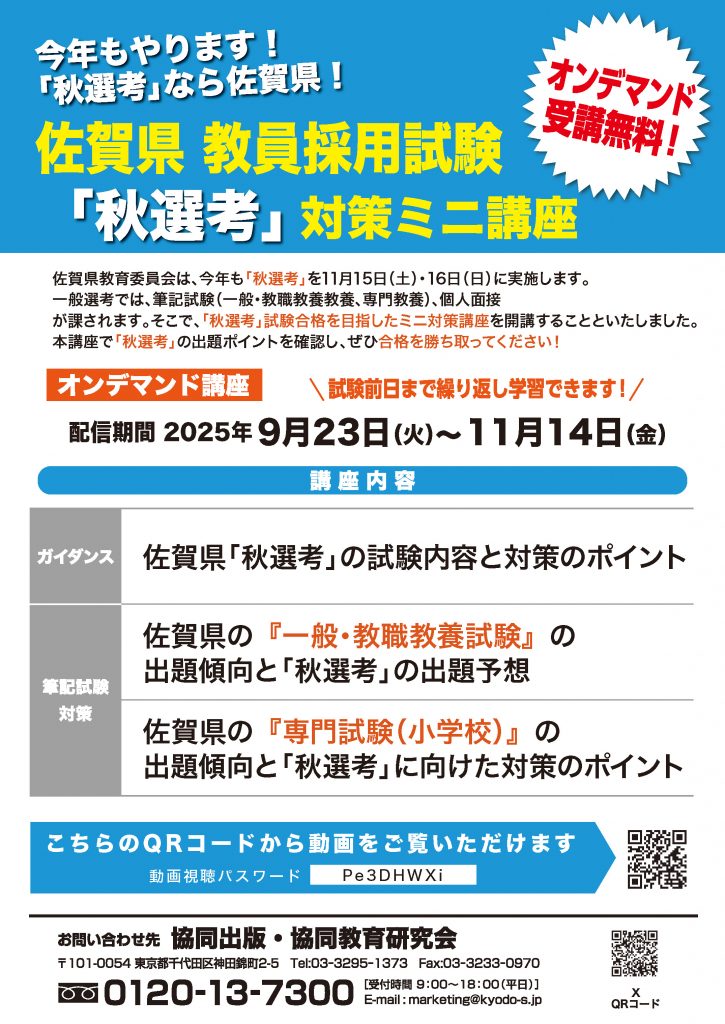 【参加無料/オンデマンド開催】「佐賀県教員採用試験『秋選考』対策ミニ講座」のお知らせ