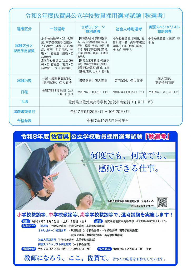 2025年9月23日~11月14日の間、「佐賀県教員採用試験『秋選考』対策ミニ講座」を実施いたします。